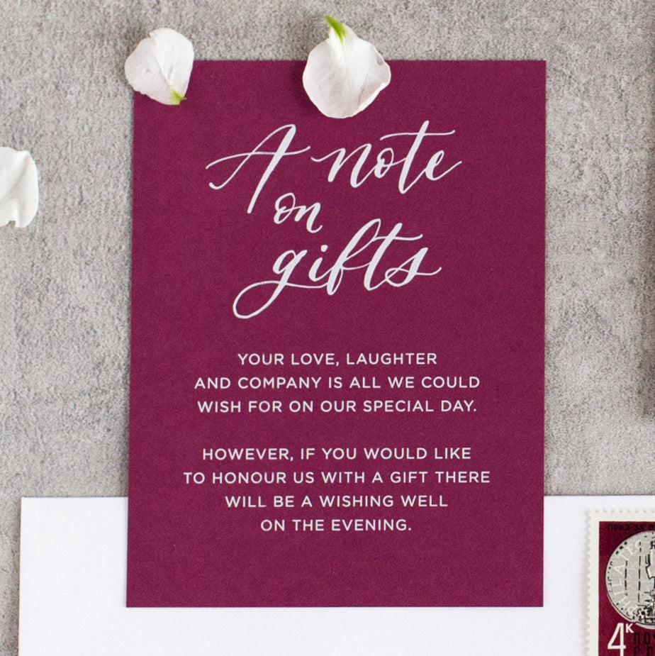• Wishing Well - "Your presence is the greatest gift of all, however, should you wish to celebrate with a gift a wishing well will be available on the night"